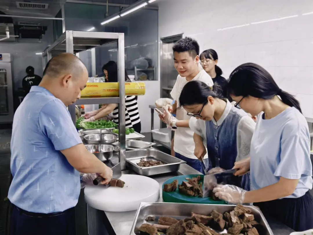 美食节前夕,当夜幕降临,洪梅园区内却灯火不熄。9月11日晚,食堂厨房里热闹非凡,各位摊主变身大厨,加班加点,只为在美食节上呈现最完美的味觉享受。切、卤、炖、煮,技艺纷呈,空气中弥漫着诱人的香气,每一道菜品都承载着摊主们的心血与创意,为即将到来的美食节添上了几分温情与期待。